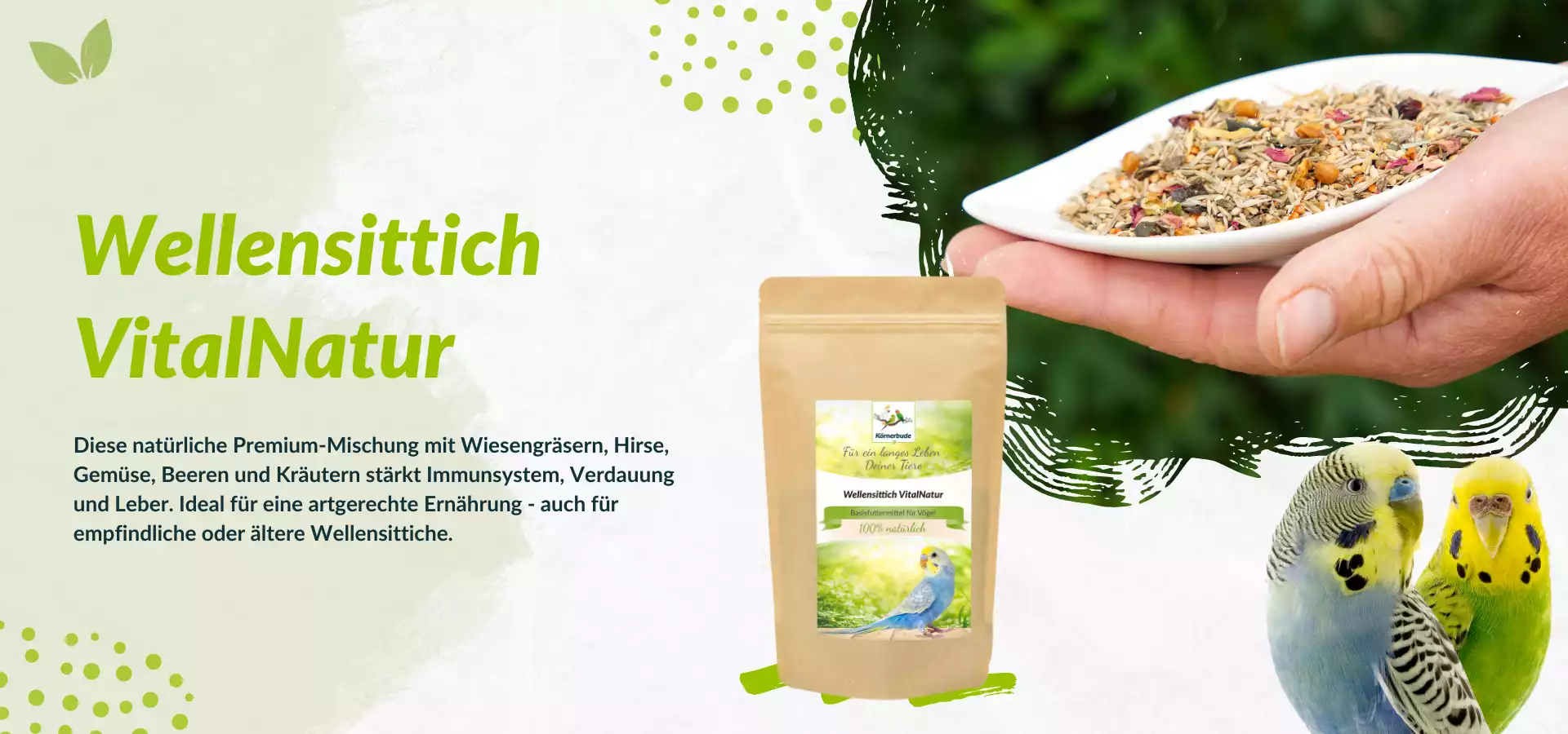 Unsere Wellensittich VitalNatur ist eine ausgewogene Premium-Futtermischung, die speziell für die tägliche Versorgung von Wellensittichen entwickelt wurde. Mit einem hohen Anteil an nährstoffreichen Wiesengräsern, vielfältigen Hirsesorten, schonend getrockneten Gemüse- und Beerenelementen sowie ausgewählten Kräutern unterstützt diese Mischung das Wohlbefinden Ihrer Vögel auf natürliche Weise.