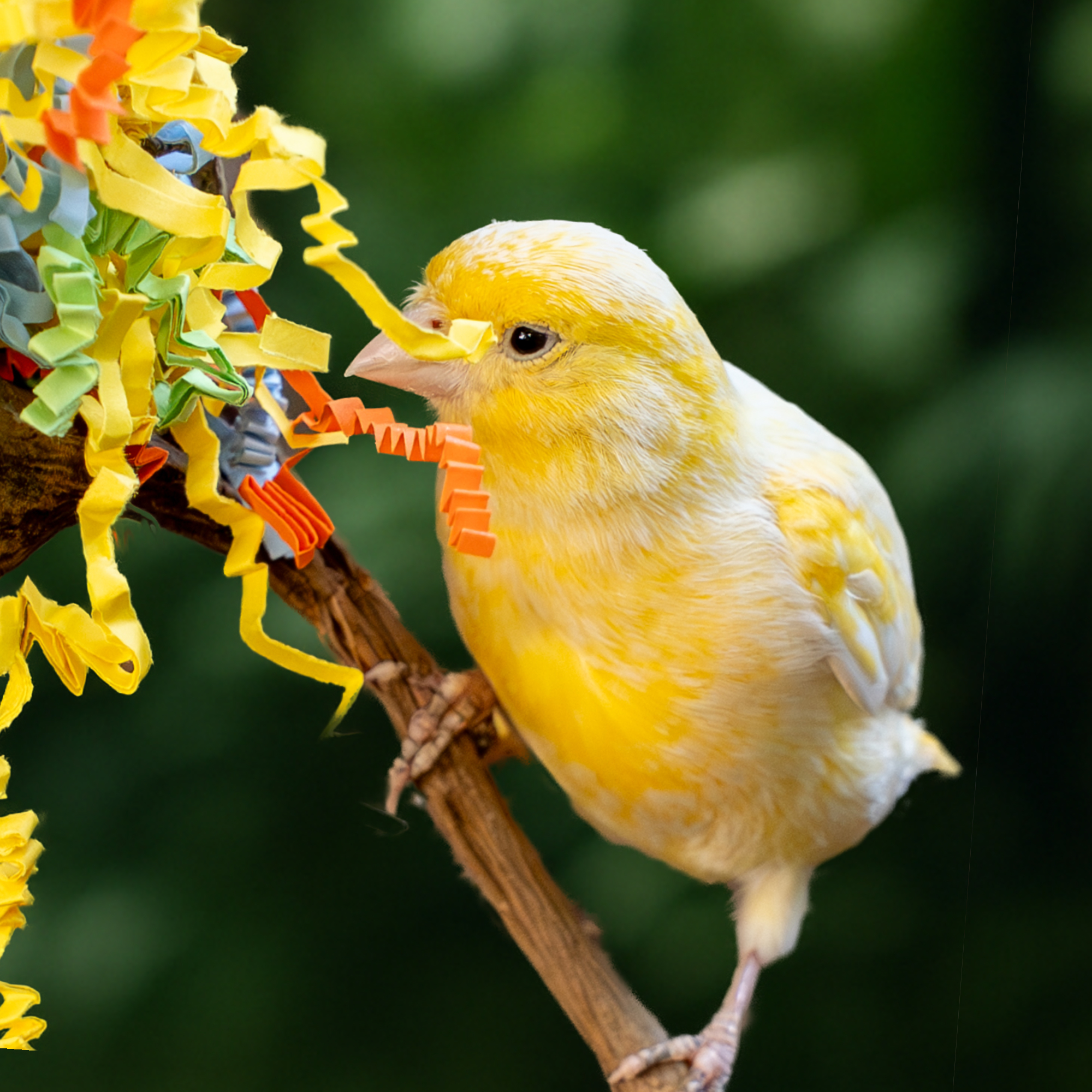 Holzspielzeug mit Kokos & Papierbändern – Knabberspaß für Großsittiche & Nymphensittiche
