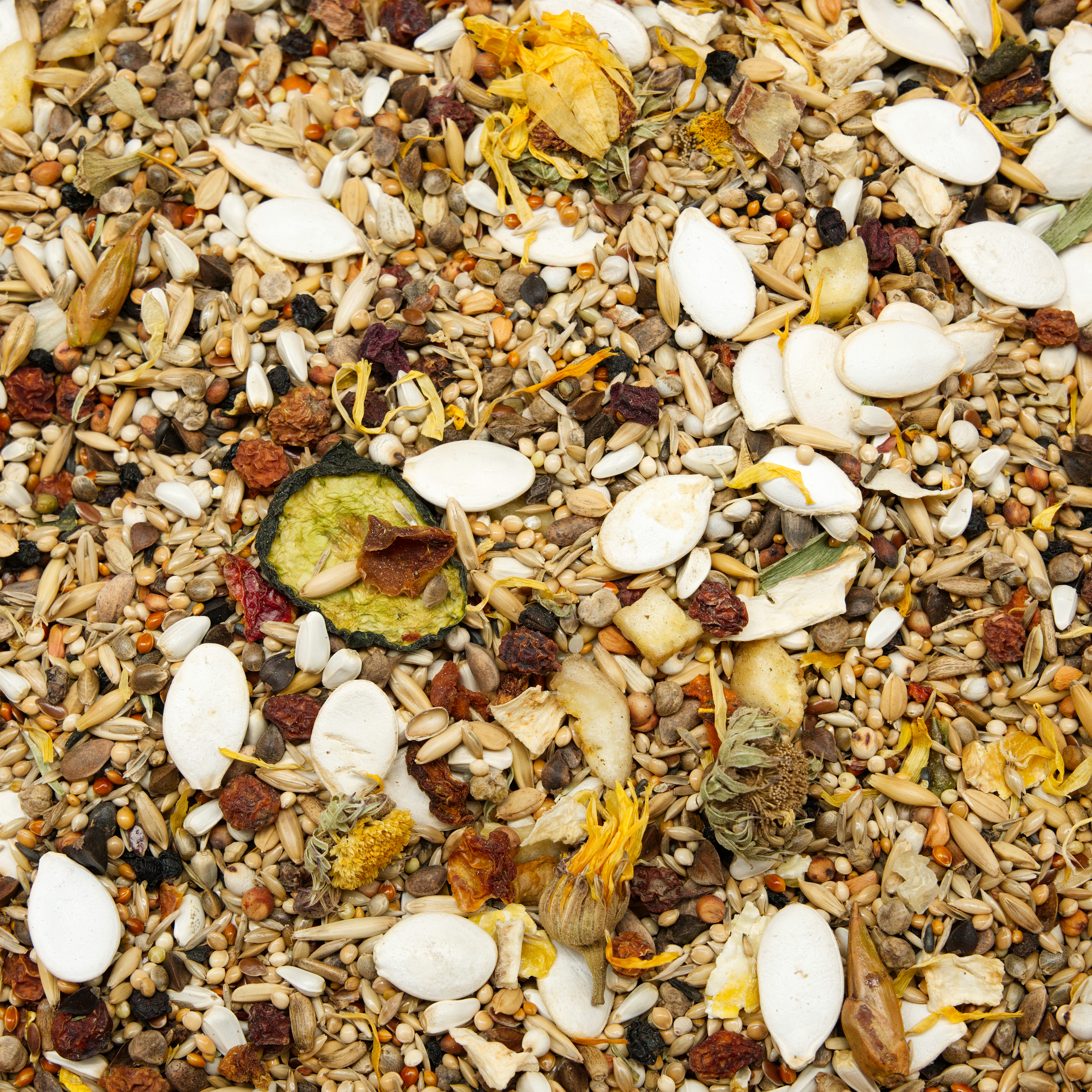 Glanzsaat, Silberhirse, Platahirse, Kardi, Buchweizen, Rote Hirse, Hanf, Dari, Leinsamen, Hafer, Milo, Mohairhirse, Spinatsamen, Paddyreis, Negersaat, Mariendistelsamen, Kleesaat, Kiefernsamen, Kürbiskerne, Hagebuttenkerne, Grassamen, Zirbelnüsse, Wildsamen, Dotterlein, Karottenwürfel, Rote Beete Würfel, Selleriewürfel, Pastinakenwürfel, Paprika-Mix, Kürbiswürfel, Zucchiniwürfel, Johannisbrot, Lauchflocken, Kartoffelwürfel, Erbsenflocken, Tomatenflocken, Gurkenscheiben, Ebereschenbeeren, Knuspermais, Ringelblumenblüten, Holunderbeeren, Topinambur, Bananenchips, Pappelknospen