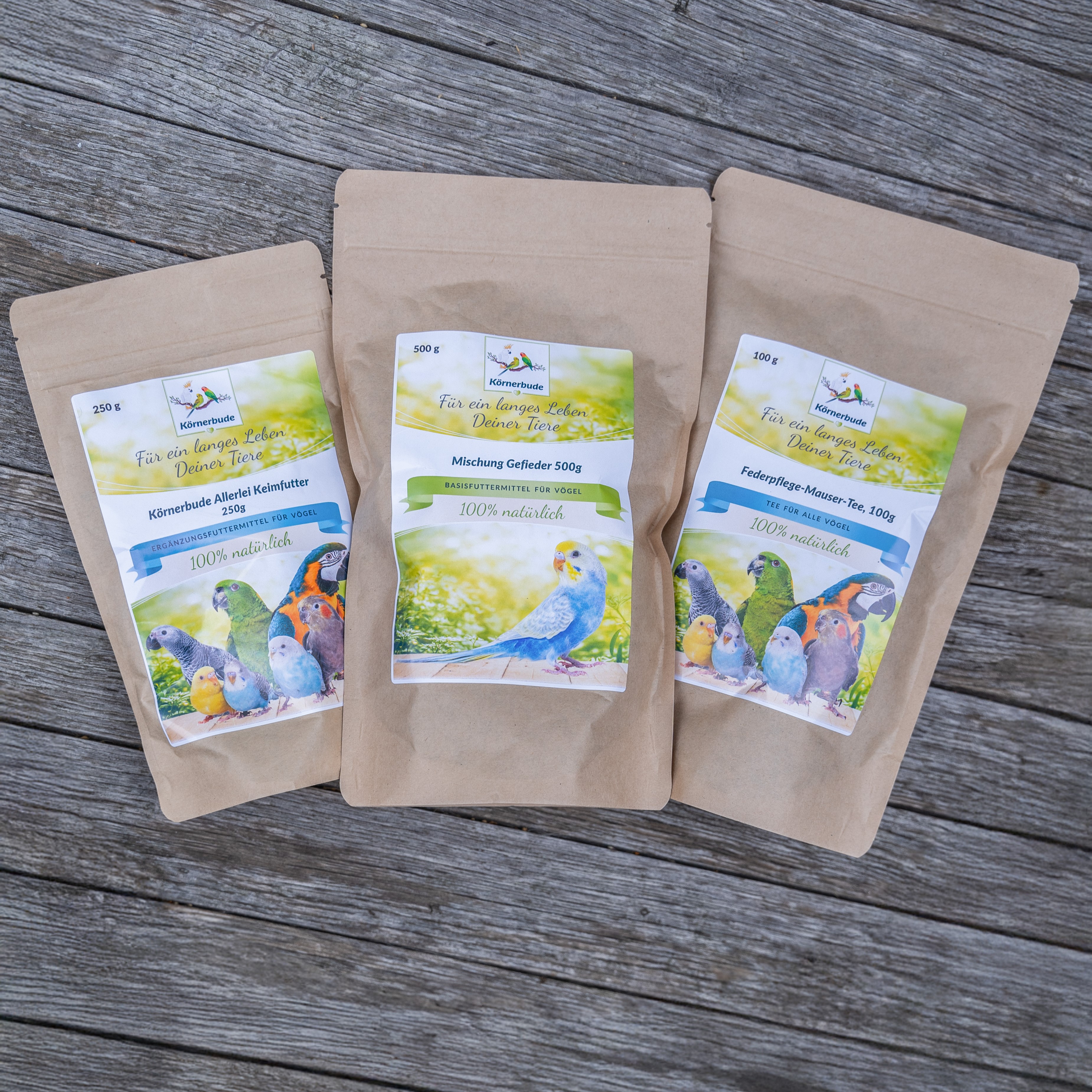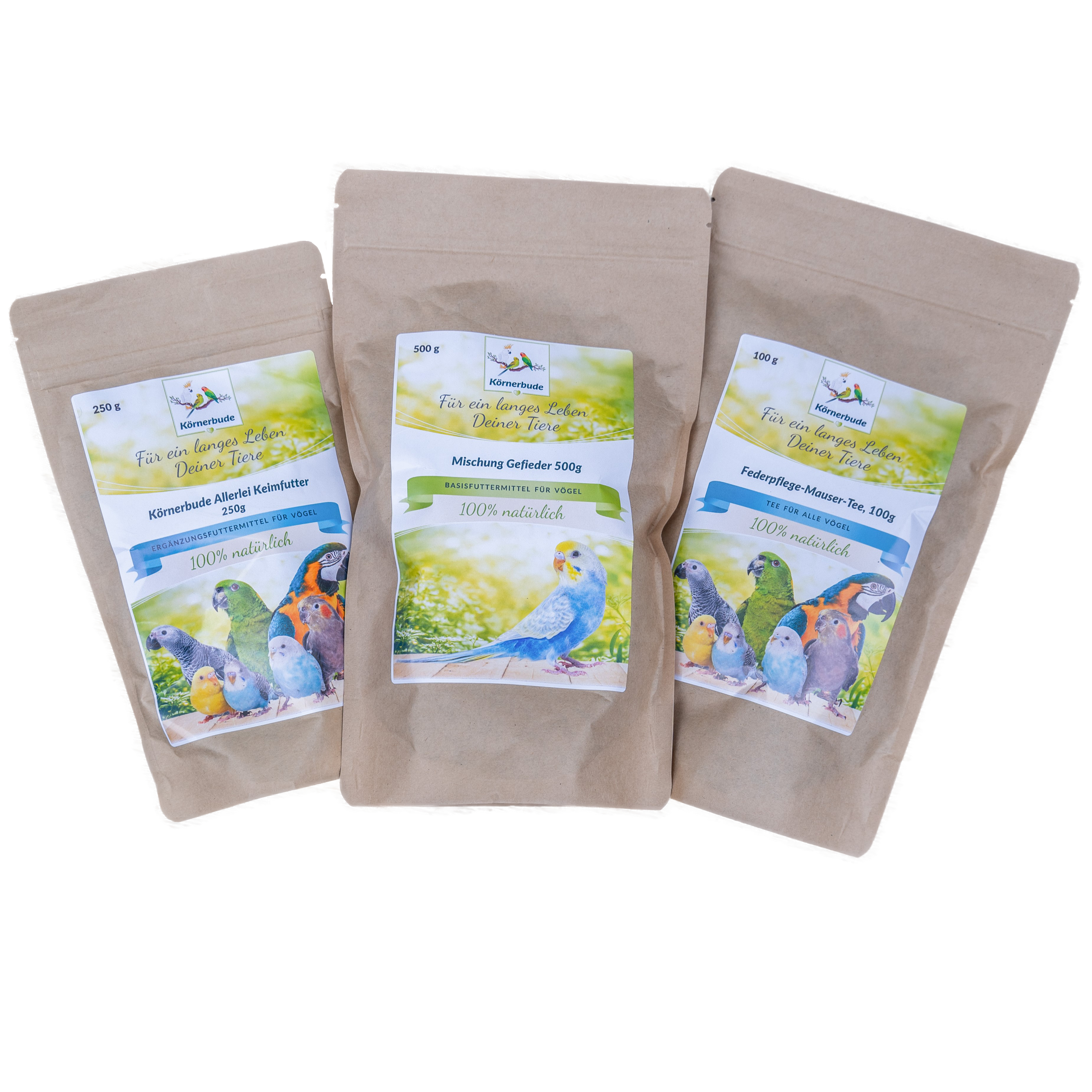 Das Gefiederpflege-Set ist ideal, um die besonderen Anforderungen deiner Sittiche in der Mauserzeit abzudecken. Die Kombination aus hochwertigem Keimfutter, einer gezielten Kräutermischung und dem wohltuenden Tee bietet eine Rundumversorgung für glänzendes Gefieder, eine gute Hautgesundheit und ein starkes Immunsystem.