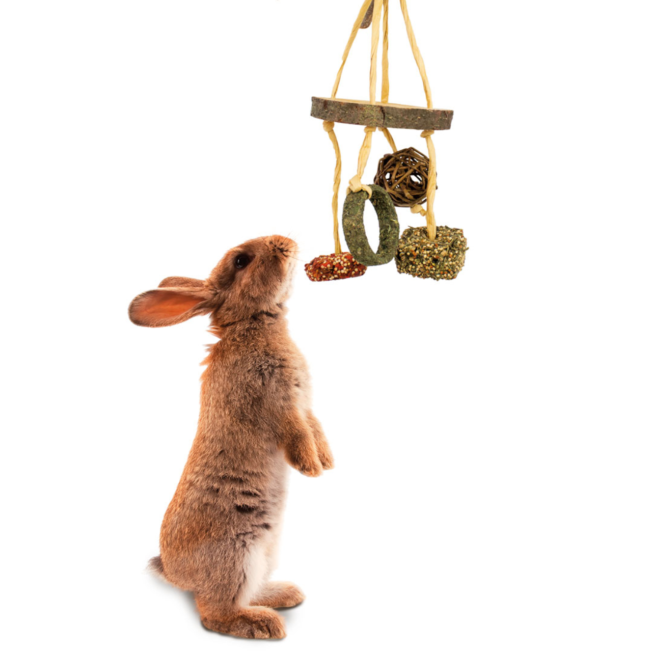 Voll verzehrbares Mobile aus schmackhaft bestückten, unbehandelten Naturhölzern und Weide vertreibt Langeweile im Nagerheim.Dieses Mobile hat es in sich. Es bringt Bewegung in den Alltag und bietet gleichzeitig eine leckere Auswahl an wertvollen Saaten und Kräutern, knusprigen Keksen und aromatischem Gemüse. Eine ideale und gesunde Knabber-Vielfalt, die den Stoffwechsel und die Blutbildung anregt, die Verdauungsorgane unterstützt und zusätzlich den physiologischen Zahnabrieb fördert. Das Mobile kann an jeder beliebigen Stelle im Nagerheim aufgehängt werden.