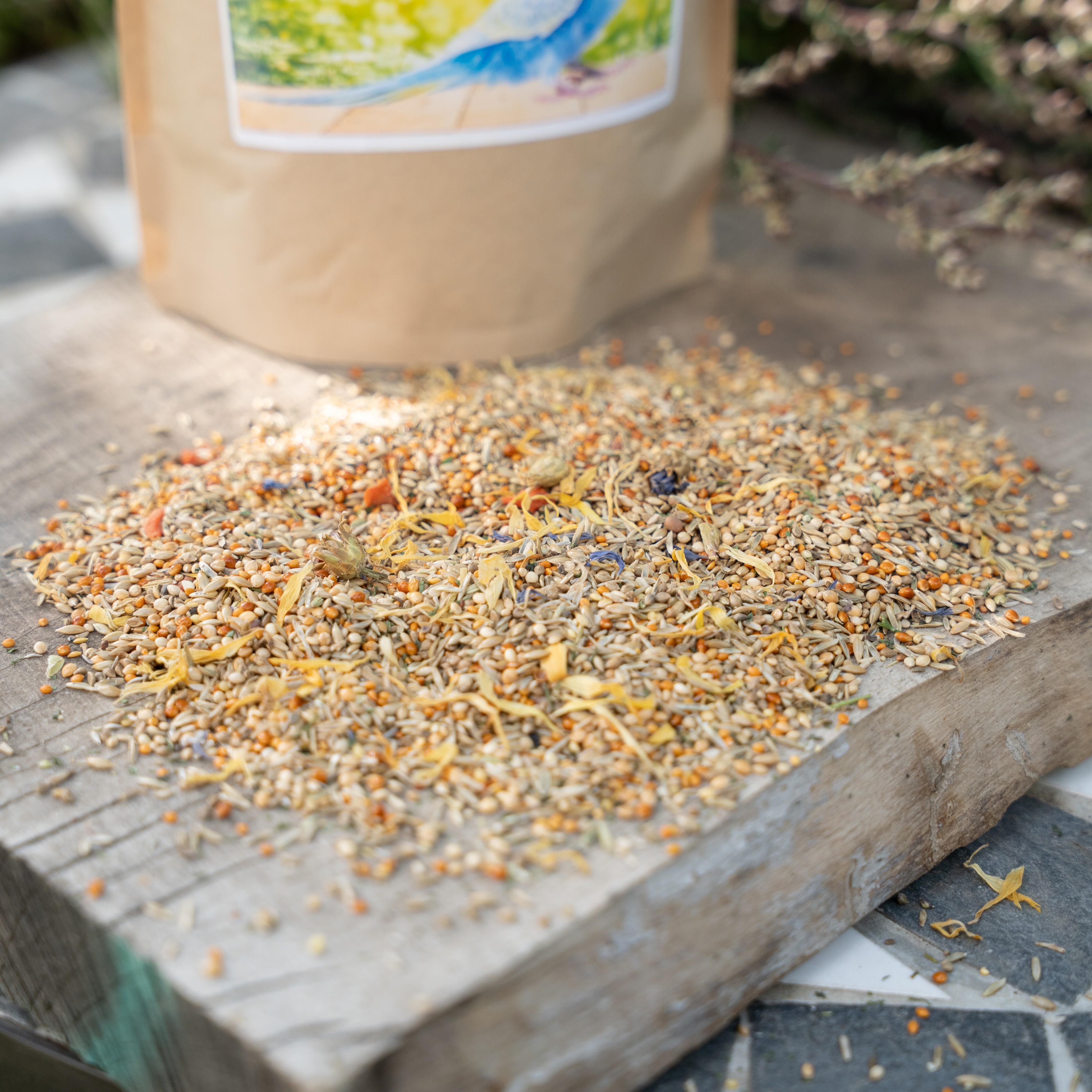 • Farbenfrohe Blütenpracht: Neben den nährstoffreichen Saaten und Körnern enthält unsere Premium-Mischung auch Ringelblumen- und Kornblumenblüten, die eine wunderbare Farbvielfalt in den Futternapf bringen und natürliche Antioxidantien liefern.