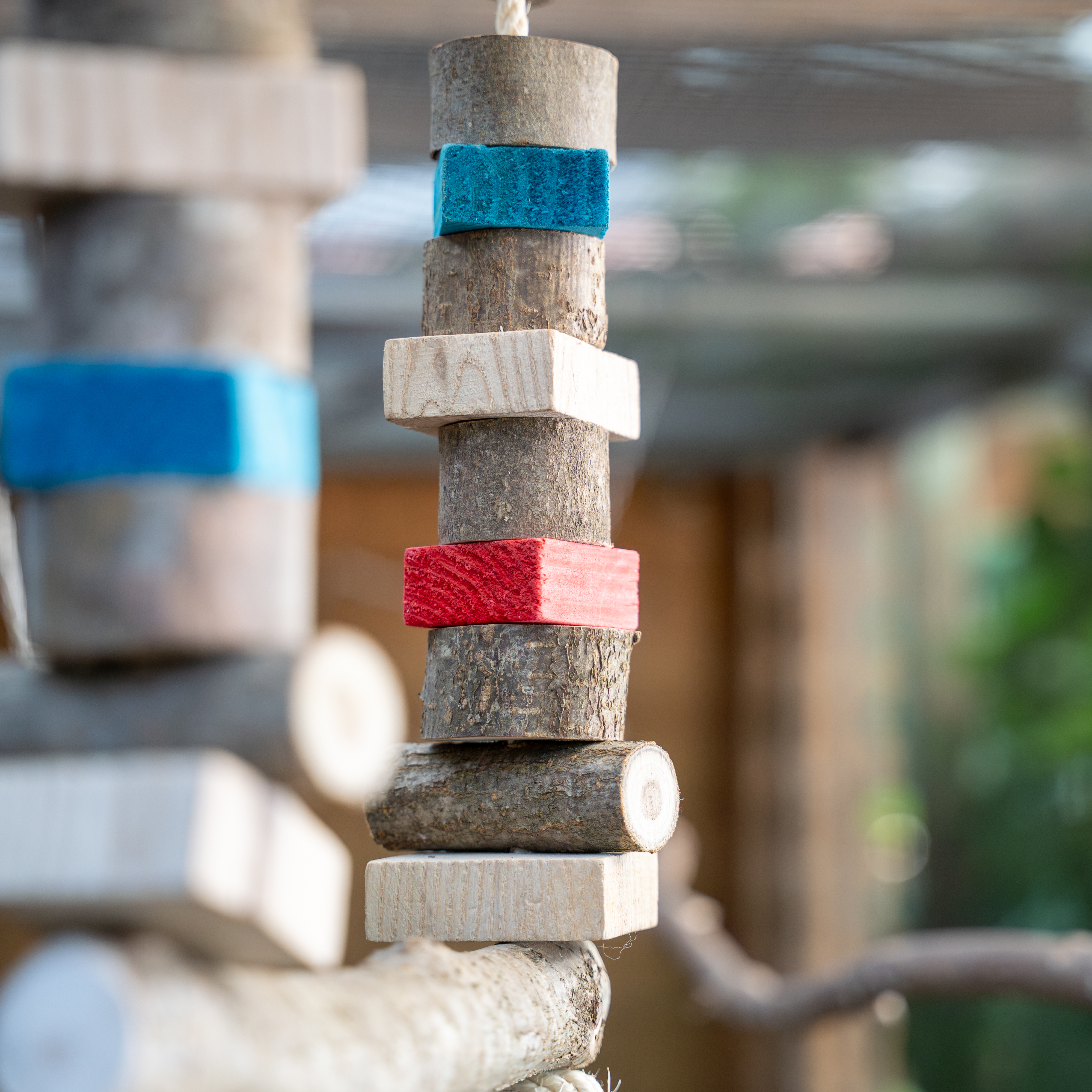Damit bei den Vögeln keine Langeweile aufkommt, werden immer unterschiedliche Hölzer die sich in Härte, Farbe und Geschmack unterscheiden verwendet. Dies sind z.B.: Buche, Eiche, Fichte, Weide, Linde, Pappel, Eberesche, Birke, u.a. Einige MG Holzspielzeuge enthalten zudem noch Tuffgestein, Lavagestein, Weidenbälle oder MG Mineralsteine. Diese dienen der Schnabelpflege bzw. der Mineralstoffversorgung und werden von den Vögeln gern bearbeitet und gefressen