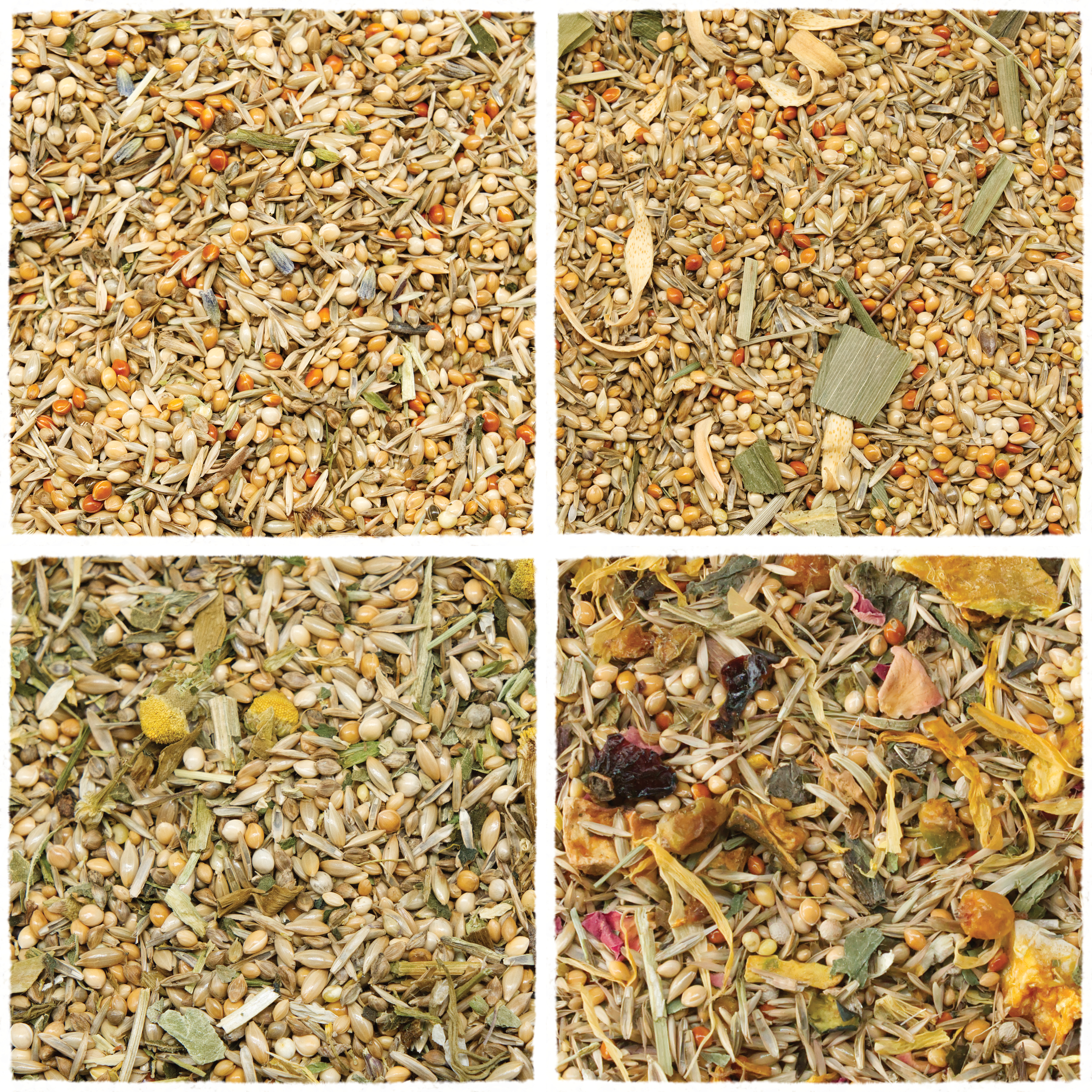 Diese Mischung enthält eine optimale Zusammenstellung aus Kanariensaat, La Plata Hirse, Silberhirse, Japanhirse, Senegalhirse, gelbe + rote Mohairhirse, rote Hirse, Grüne Hirse, Rote Mannahirse, Teff-Zwerghirse hell, Teff-Zwerghirse dunkel, Wiesengräser, Goldhirse bio geschält, Salatsamen, Fonio Paddy, Kleesamen, Amaranthsamen, Eukalyptusblätter, Bambusblätter geschn., Orangenblütenblätter. -