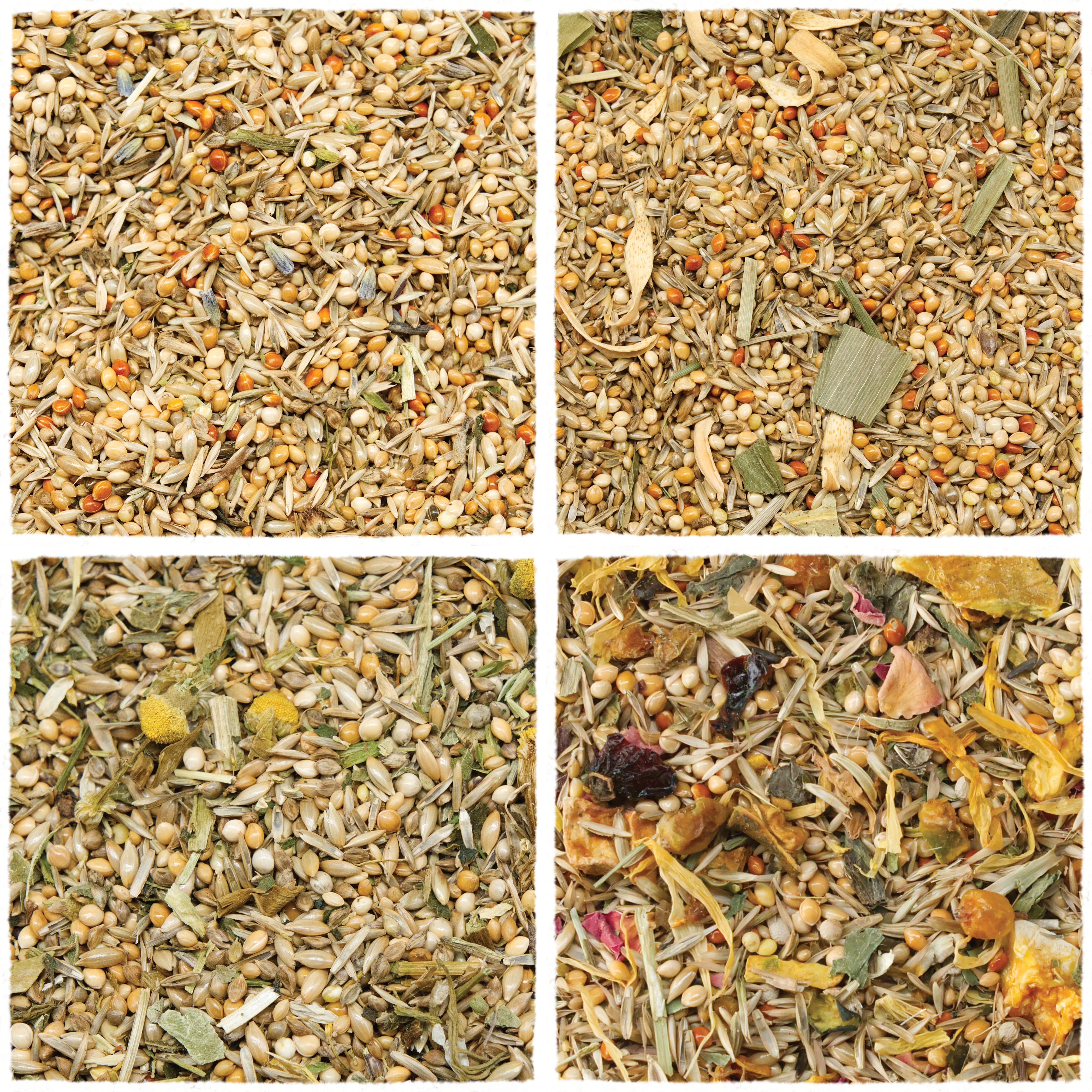 Diese Mischung enthält eine Kombination aus Platahirse, Wiesengräser (Weidelgras, Glatthafer, Wiesenrispe), Senegalhirse, Silberhirse, Rote Hirse, Glanzsaat, Kürbiswürfel, Zucchinistückchen, Mariendistelblätter, Nigersaat, Löwenzahnkraut, Brennnesselblätter, Echinacea, Ringelblumenblütenblätter, Hagebuttenschalen, Sanddornbeeren, Chisamen, Fenchelsamen, Perillasaat, Rosenblüten, Blütenpollen. -