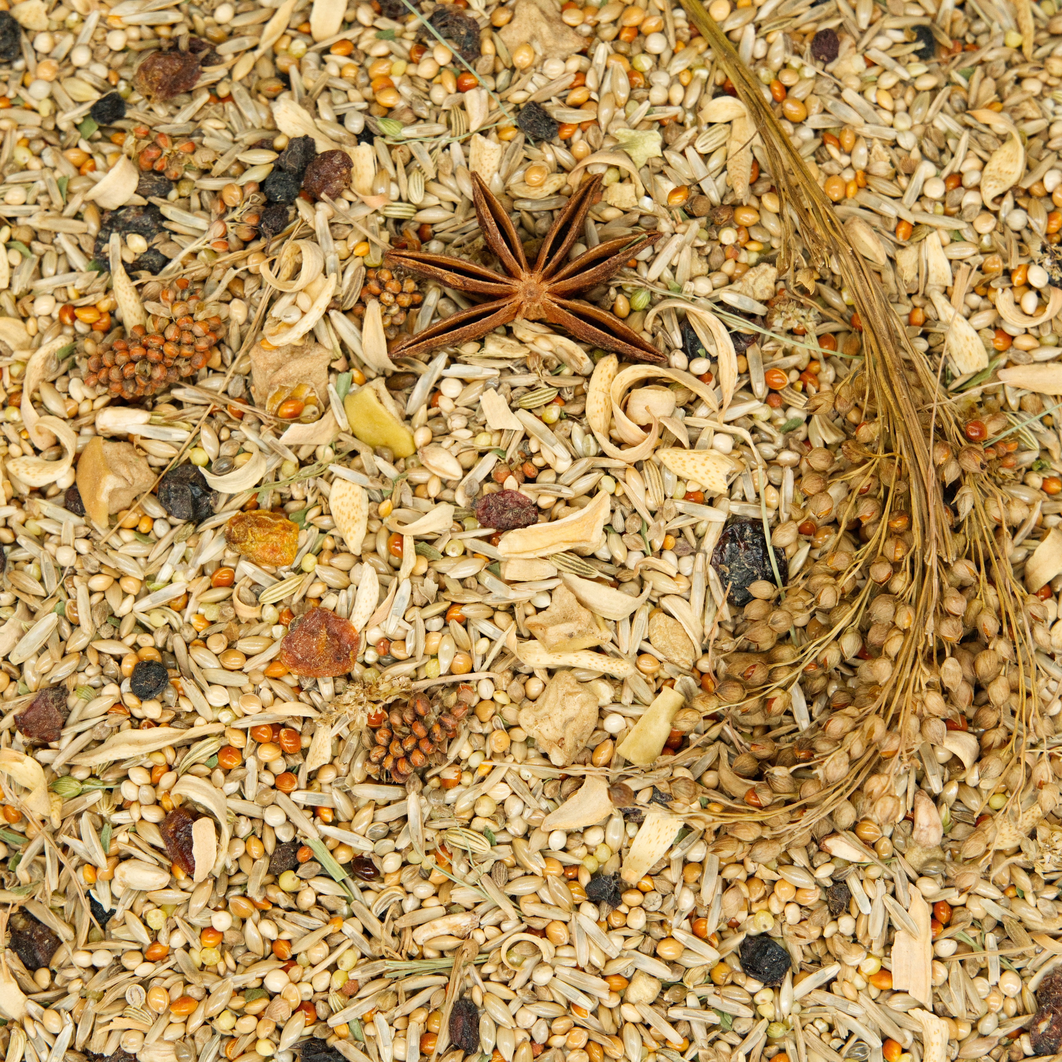 Spitzsaat, Rotschwingel, Wiesenschwingel, Wiesenlieschgras, Deutsches Weidelgras, Rohrschwingel, Knaulgras, Wiesenrispe, echte La Plata Hirse, Japanhirse, Bulcamhirse, Senegalhirse, Gelbe Hirse, Schwarze Hirse, gelbe Mohairhirse, Marokkohirse, rote Hirse, Mohairhirse (dreifarbig), Grüne Hirse, rote Mohairhirse, Rote Mannahirse, Teff Zwerghirse, Bio-Goldhirse, Rispenhirse, Kolbenhirse (rot + gelb), Holunder, Berberitzenbeeren, Apfelwürfel, Sanddornbeeren, Orangenblüten, Anissterne, Ingwerwurzel, Anis, Fenchel, Wiesenpastinaken, Estragon, Granatapfelkerne
